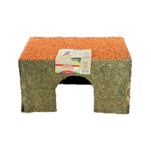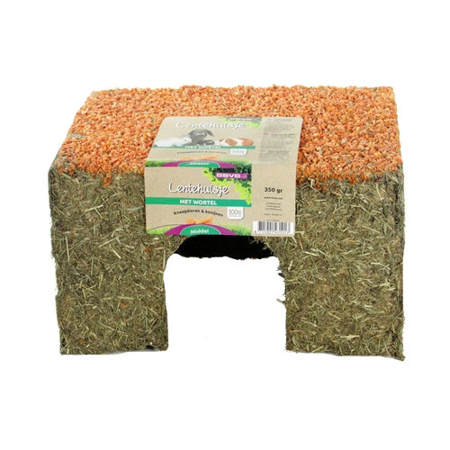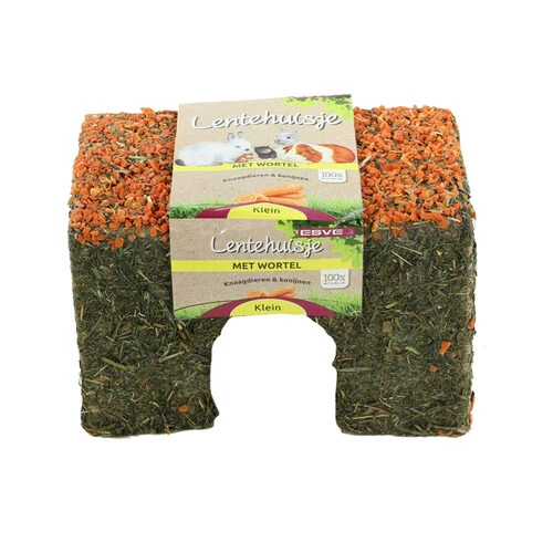 Das Heuhaus von ESVE ist ein natürliches und ergänzendes Produkt für Kaninchen und Nagetiere. Ob schlafen, knabbern, verstecken, klettern oder nagen, dies alles wird mit dem Grashaus Lentehuis Wortel ermöglicht. Ein ideales Produkt für kleine Nager. Die Häuser sind aus natürlichen Materialien hergestellt und sorgen dafür, dass sich Ihr Kaninchen oder Nagetier nicht mehr langweilen wird. Das Haus ist mit Grassamen und Heu bedeckt, während das Dach mit Karotten belegt ist.